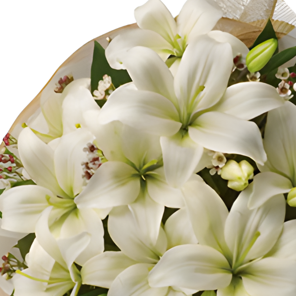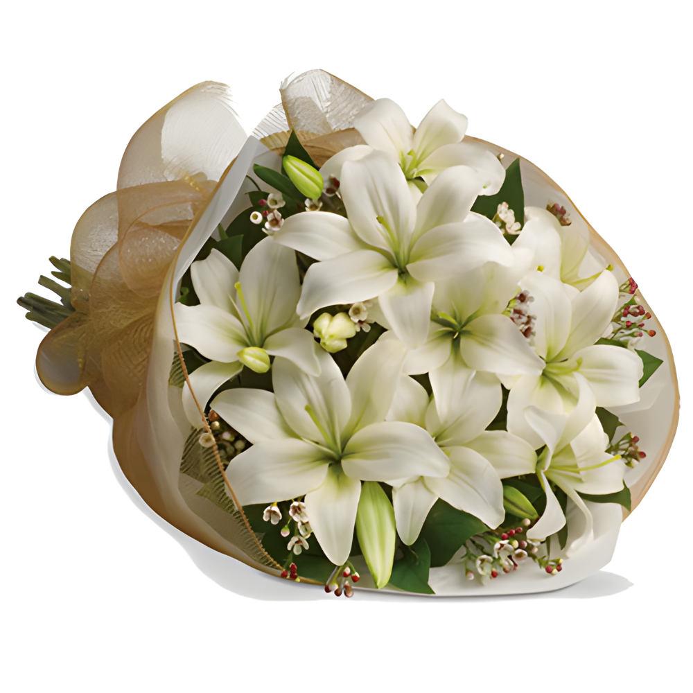 Elegant white lilies beautifully wrapped into a graceful bouquet, creating a timeless floral gift perfect for meaningful occasions with online flower delivery and same-day options available in Amman, Jordan.